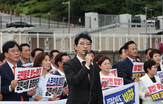 ▲국민의힘 주진우 의원이 1일 서울 용산 대통령실 앞에서 열린 현장 의원총회에서 발언하고 있다. ⓒ연합뉴스