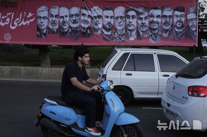 [테헤란=AP/뉴시스] 지난6월 30일 이란 테헤란 북부 타즈리시 광장에서 스쿠터와 차량이 이스라엘의 공습으로 사망한 이란군 지휘관들과 핵 과학자들의 초상이 담긴 현수막 옆을 지나가고 있다. 2025.07.06. |