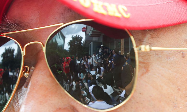 임성근 전 해병대 1사단장이 2일 서울 서초구에 마련된 이명현 순직해병 특검 사무실에 출석한 가운데 한 해병대예비역연대 회원의 선글라스에 임 전 사단장의 모습이 비치고 있다. 공돋취재사진 |