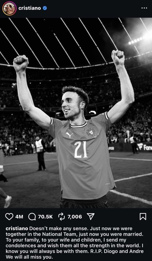 호날두 역시 소셜 미디어를 통해 "말도 안 된다. 우리는 방금 전까지 국가대표팀에서 함께 있었고, 너는 이제 막 결혼했다. 너의 가족과 아내, 자녀들에게 애도를 표한다. 세상의 모든 힘이 그들에게 닿기를 바란다. 네가 항상 그들과 함께할 거라는 사실을 알고 있다. 디오구와 안드레, 편히 쉬기를(R.I.P). 우리 모두 당신을 그리워할 것"이라며 슬퍼했다.