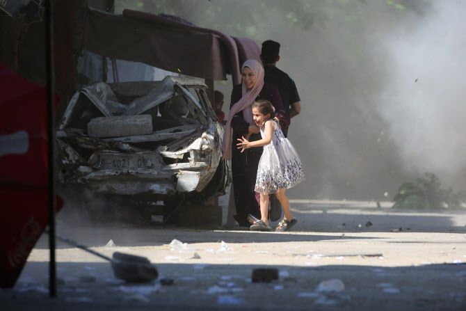 4일(현지시간) 가자지구 중부 알-부레이지 난민캠프에서 이스라엘의 공습이 발생하자 한 팔레스타인 여성과 그녀의 딸이 몸을 피하고 있다. (사진=AFP)