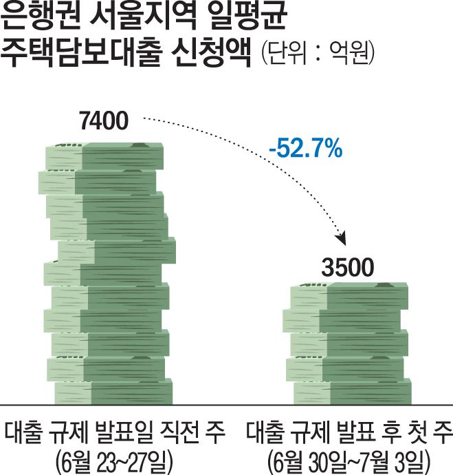 6일 금융당국과 은행권에 따르면 지난달 30일부터 이달 3일까지 서울 지역 은행권의 일평균 주담대 신청액은 3500억 원대로 집계됐다. 이는 규제 발표 직전 주(6월 23~27일) 일평균 신청액이 약 7400억 원 수준이었던 것과 비교하면 52.7%나 감소한 수치다. 특히 규제 발표 당일인 지난달 27일에는 주담대 신청액이 하루 만에 1조 원에 가까웠던 것으로 전해져 기습적인 규제로 시장 심리가 크게 위축됐다.