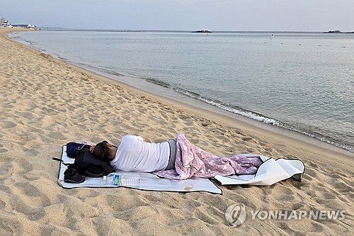 강릉 7일째 열대야 지속…강릉 경포해변의 아침(강릉=연합뉴스) 유형재 기자 = 강원 강릉지역에 지난 6월 29일부터 7일째 열대야가 지속되는 가운데 6일 새벽 무더위에 잠을 못 이룬 피서객과 시민들이 경포해변 백사장에서 잠을 자고 있다.     이날 밤 강릉의 최저기온은 29.5도를 기록했다. 2025.7.6 yoo21@yna.co.kr