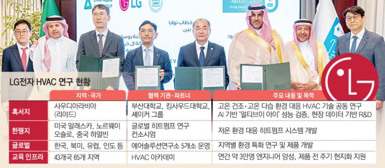 LG전자는 3일(현지시간) 사우디아라비아 리야드에서 부산대학교, 킹사우드대학교(King Saud University), 셰이커 그룹(Shaker Group)과 함께 고온 건조한 사막 지역과 고온 다습한 열대 지역 등 이른바 ‘혹서지’ 환경에 최적화된 HVAC 기술 공동 연구를 진행하기로 했다고 6일 밝혔다.