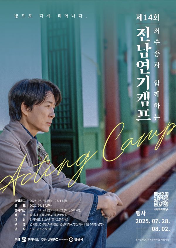 전라남도와 (사)전남영상위원회가 제14회 최수종과 함께하는 전남 연기캠프 참가 학생을 50명을 오는 14일까지 모집합니다.시진제공 전남도청[전남도청=팍스경제TV] 전라남도와 (사)전남영상위원회가 '제14회 최수종과 함께하는 전남 연기캠프' 참가 학생 50명을 오는 14일까지 모집합니다. 최수종과 함께하는 전남 연기캠프는 전남지역 중·고등학생을 대상으로 진행되는 숙박형 캠프입니다. 지난 2010년부터 13년간 매년 여름방학 프로그램으로 운영하고 있습니다.