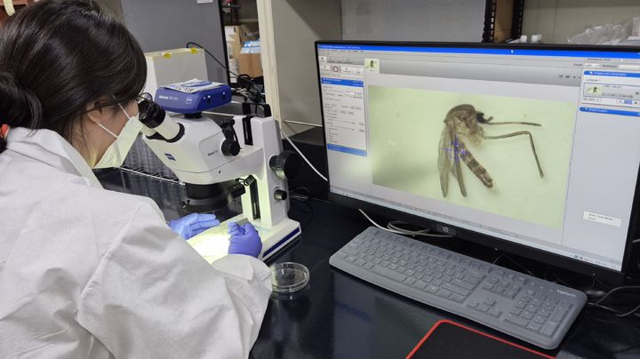 [안동=뉴시스] 채집 모기를 살펴보고 있는 경북도보건환경연구원의 직원. (사진=경북도 제공) 2025.07.06. photo@newsis.com *재판매 및 DB 금지