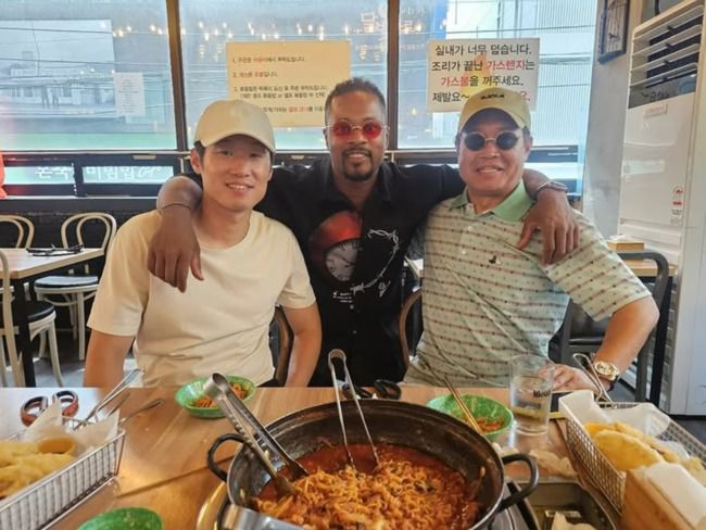 에브라는 지난 4일 자신의 SNS에 "가족이 재결합했다"라면서 한 사진을 게시했다. 박지성과 그의 아버지와 함께 어깨동무한 사진을 게시했는데 그들의 앞에는 떡볶이가 있었다.