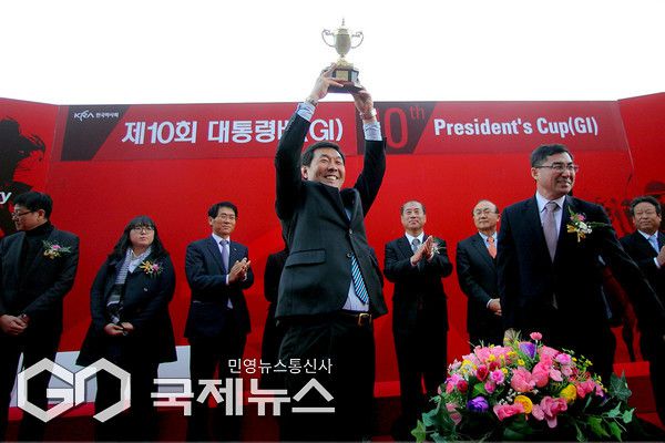 대통령배 우승을 차지했던 김영관 조교사가 우승트로피를 들어보이고 있다/제공=마사회 부경 |