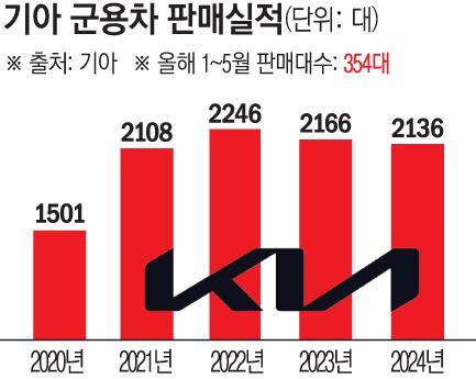 6일 완성차 업계에 따르면 기아의 군용차 판매량은 2020년 1501대에서 2021년 2108대로 급증한 뒤, 2022~2024년에도 연간 약 2100대 수준을 유지했다. 올해 들어서도 5월까지 354대를 판매하며 견조한 흐름을 이어가고 있다.