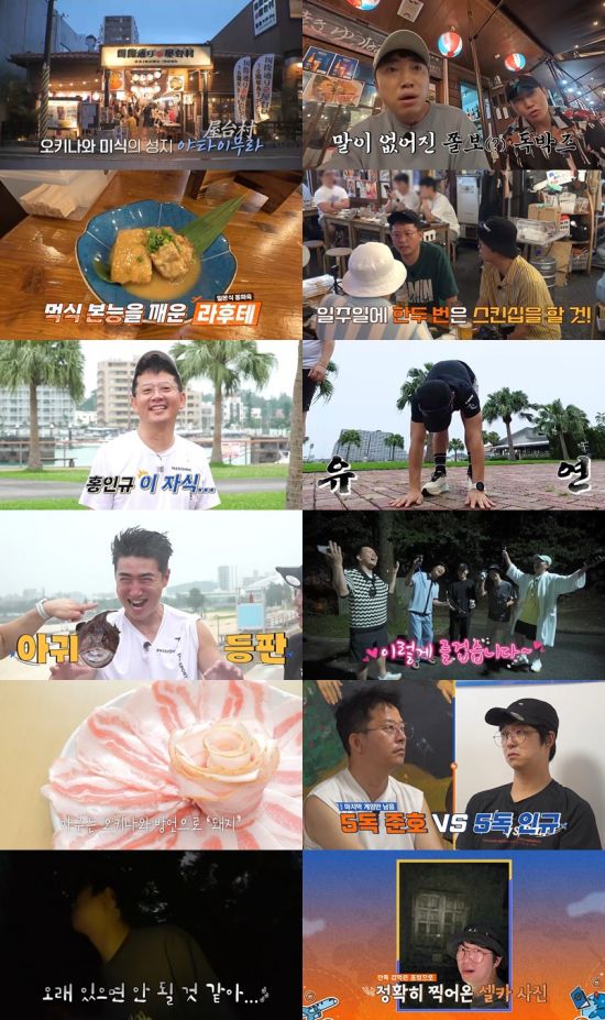 이날 ‘독박즈’는 오는 13일 김지민과 결혼하는 김준호를 위해 “총각으로서 마지막으로 함께 하는 여행이니 만큼 ‘총각 파티’를 해주자”며 오키나와 미식의 성지인 ‘야타이무라’로 향했다. 노포 감성 가득한 ‘야타이무라’에 도착한 이들은 다양한 특산물 안주 세트를 주문했다. 이때 김준호는 ‘렌터카 비용’을 건 ‘독박 게임’으로 한국에서 챙겨온 로또 복권 2장씩을 멤버들에게 건넸다. 그러면서 그는 “당첨 번호를 맞혀 봐서 숫자가 가장 적은 사람이 독박자가 되자”고 제안했다. 직후 이들은 생방송으로 로또 복권 추첨 방송을 봤는데, 홍인규의 복권이 가장 적은 당첨 번호를 보유해 ‘독박자’가 됐다. 순식간에 5독이 된 홍인규는 “나 일본과 정말 안 맞는 것 같다”며 절규했다. 때마침 오키나와 특산물인 ‘섬락교’와 일본식 동파육인 ‘라후테’ 등이 나왔고, 폭풍 먹방을 즐기던 중 장동민은 “곧 결혼하는 준호 형을 위해 우리가 ‘부부끼리 절대 하지 말아야 할 것들’을 알려주자”며 ‘신랑 조기 교육’에 나섰다.