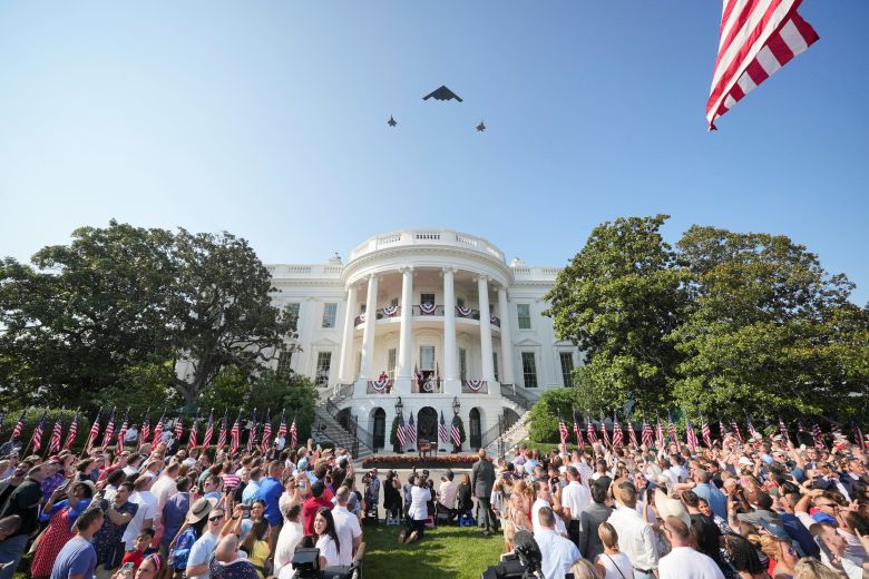 이날 백악관 잔디밭에서는 군인 가족들을 위한 연례 독립기념일 축하 행사가 열렸고, 이란 핵시설 3곳을 타격한 작전에 참여한 공군 병력 150명과 그들의 가족들이 초청됐다. 트럼프는 백악관 발코니에 올라 “미주리주 와이트먼 공군기지에서 온 150명의 공군들과 그 가족들이 함께하게 되어 영광이다. 이곳은 B-2 폭격기의 본거지”라며 “우리는 이 일에 대해 다소 조용히 해왔는데, 손을 아주 재빨리 들고 싶다면 손을 들어봐라. 여러분은 정말 놀라운 사람들”이라고 말했다. 미 언론에 따르면 트럼프의 발언에 따라 청중 중 최소 한 명이 손을 들었다. 트럼프는 “우리가 변장할 필요는 없다. 그쪽(이란)은 우릴 마치 겁쟁이처럼 본다”며 “손든 사람들 다 봤다. 정말 감사하다. 우리는 여러분께 모든 것을 빚지고 있다”고 했다.