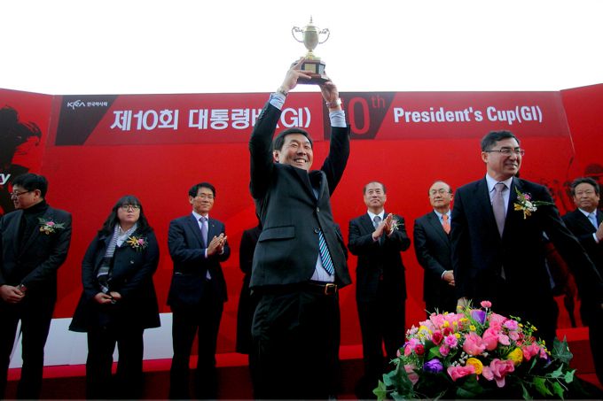 대통령배 우승을 차지했던 김영관 조교사가 우승트로피를 들어보이고 있다. [사진=한국마사회 렛츠런파크 부산경남] 2025.07.06