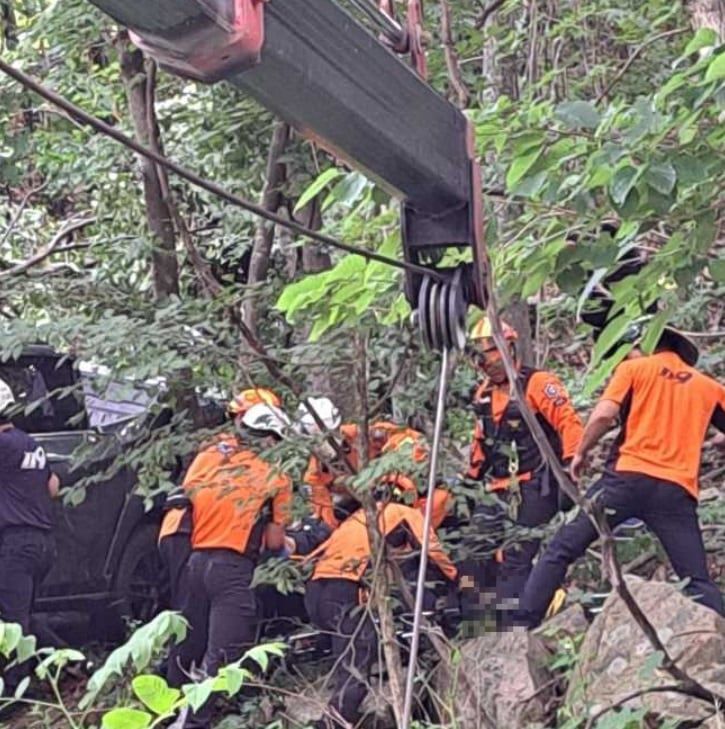 소방 당국은 추락 당시 차량이 나무 등에 걸리며 충격이 완화돼 이들이 목숨을 건진 것으로 보고 있다.