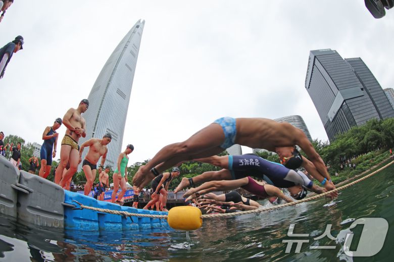6일 오전 서울 송파구 잠실 석촌호수에서 열린 2025 롯데 아쿠아슬론에서 참가자들이 출발하고 있다. (공동취재) 2025.7.6/뉴스1 ⓒ News1 김성진 기자 |