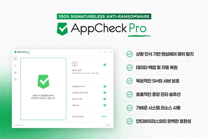 체크멀(CheckMAL)의 '앱체크 프로'(AppCheck Pro)는 특허받은 '상황 인식 기반 탐지 엔진'(CARB)이 탑재된 시그니처리스 안티 랜섬웨어 전문 솔루션이다. 랜섬웨어 행위 탐지, 실시간 데이터 백업, 자동 복원까지 하나의 제품에서 통합 제공하며, 탐지·대응 전 과정이 사용자의 개입 없이 자동으로 이뤄진다.