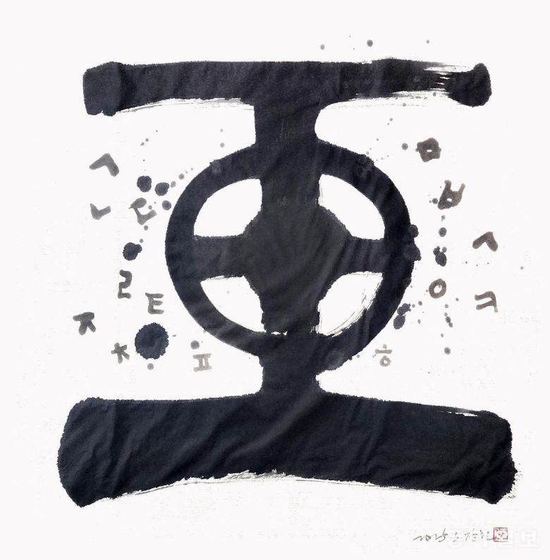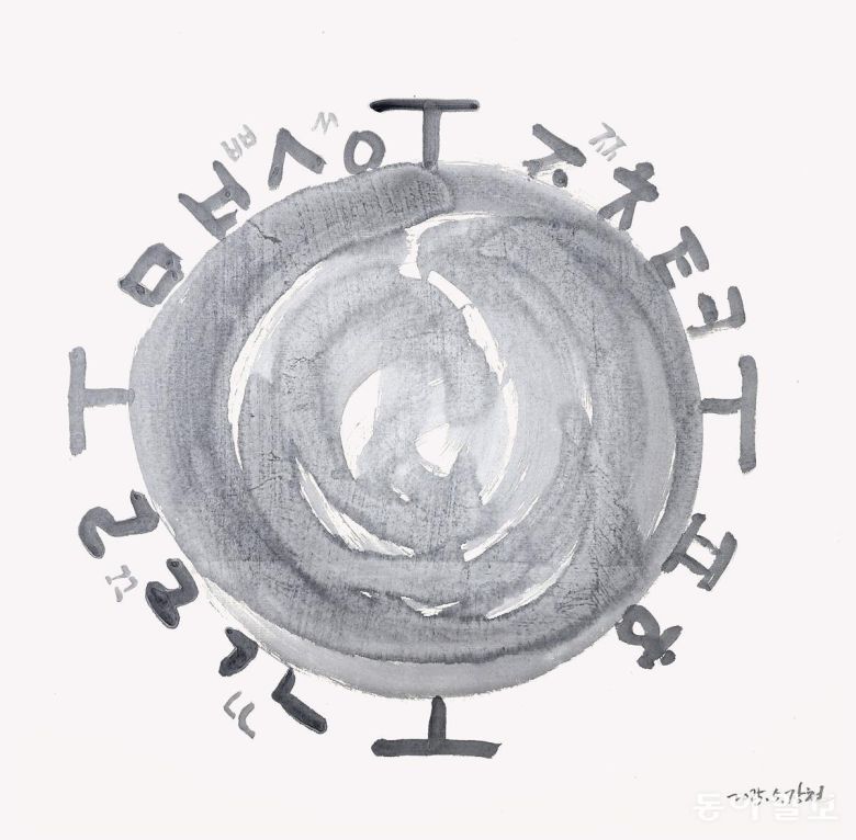 문자가 탄생하는 과정을 기호처럼 그린 작품입니다. 가운데 있는 둥그런 호는 씨알입니다. 아랫쪽에 있는 두껍고 짙은 획은 땅이고, 위에 있는 얇고 밝은 획은 하늘입니다. 씨알을 중심으로 사람(人)과 만물이 빙글빙글 돌고 있는 모양입니다. 하늘과 땅, 사람이 순환하면서 자음들이 하나둘씩 태어나고 있습니다.