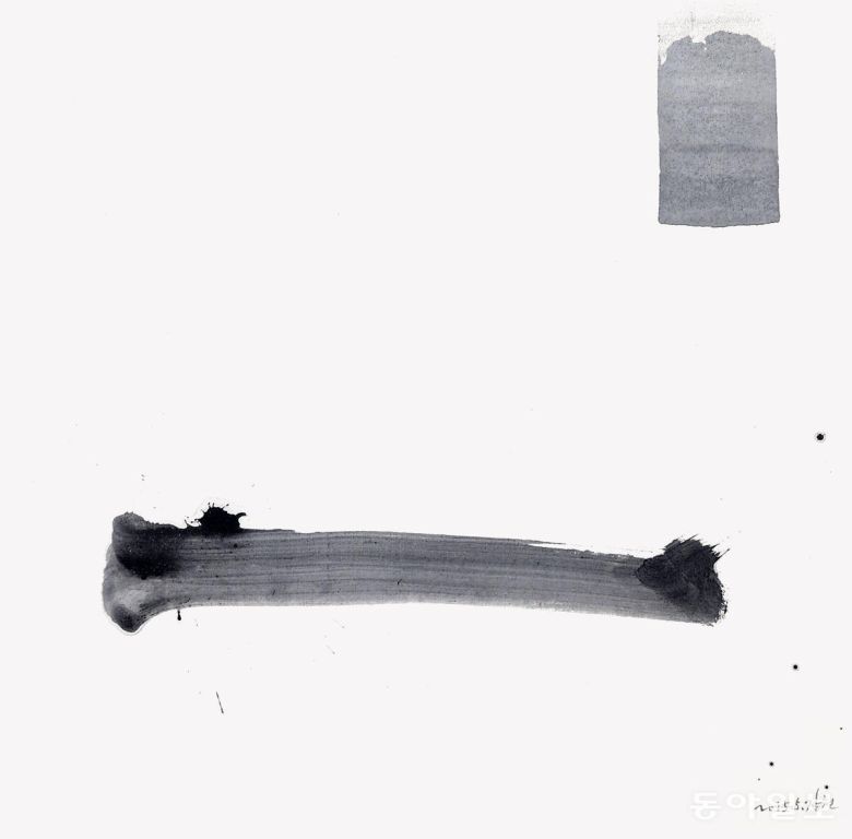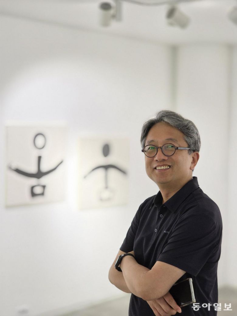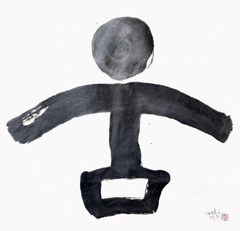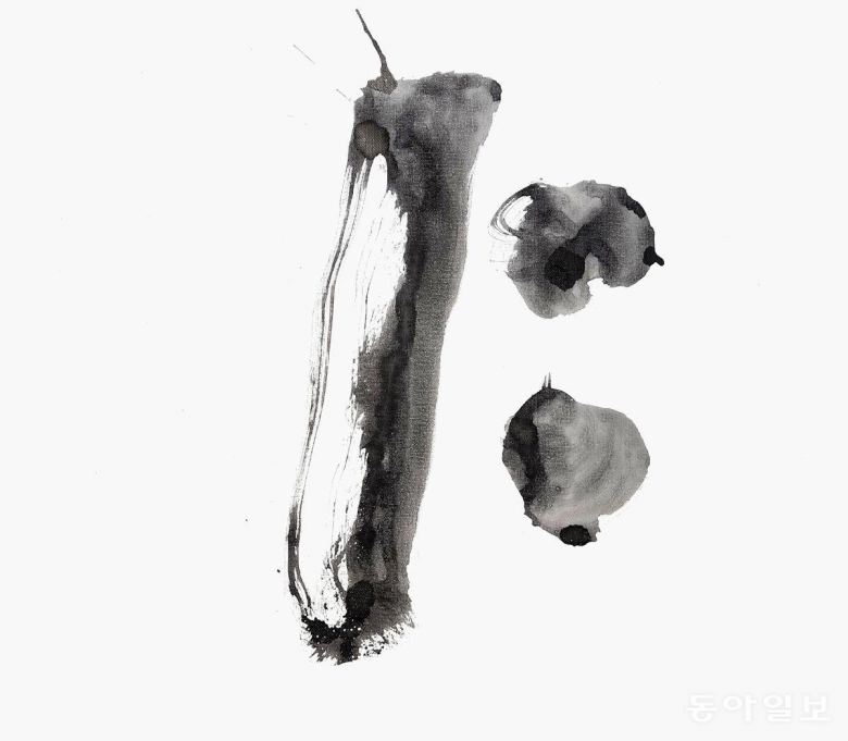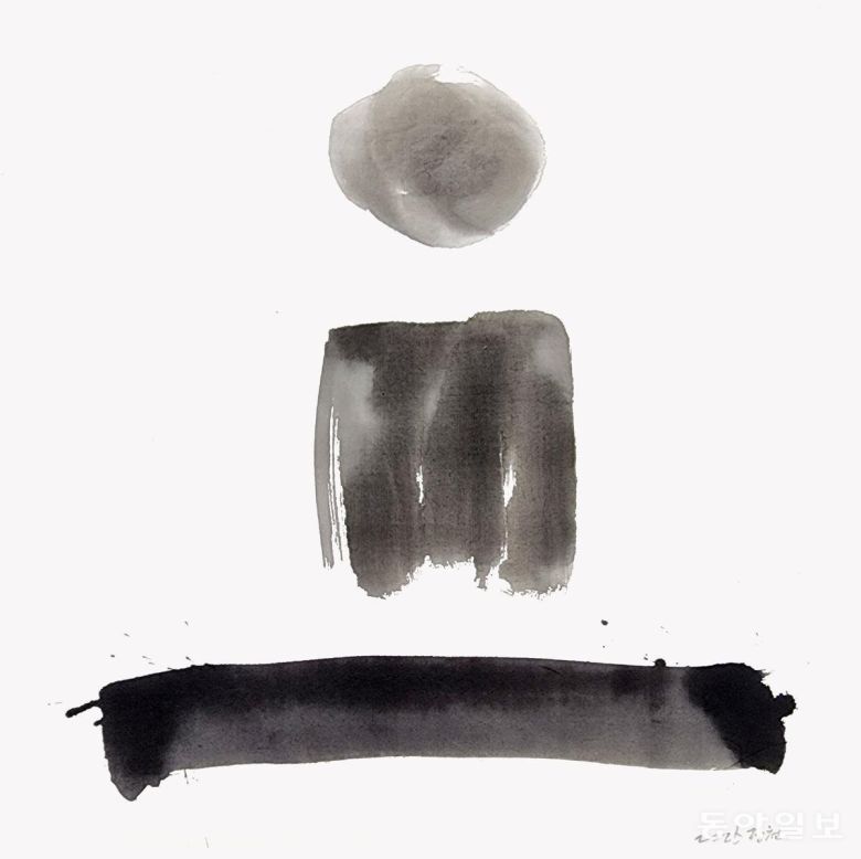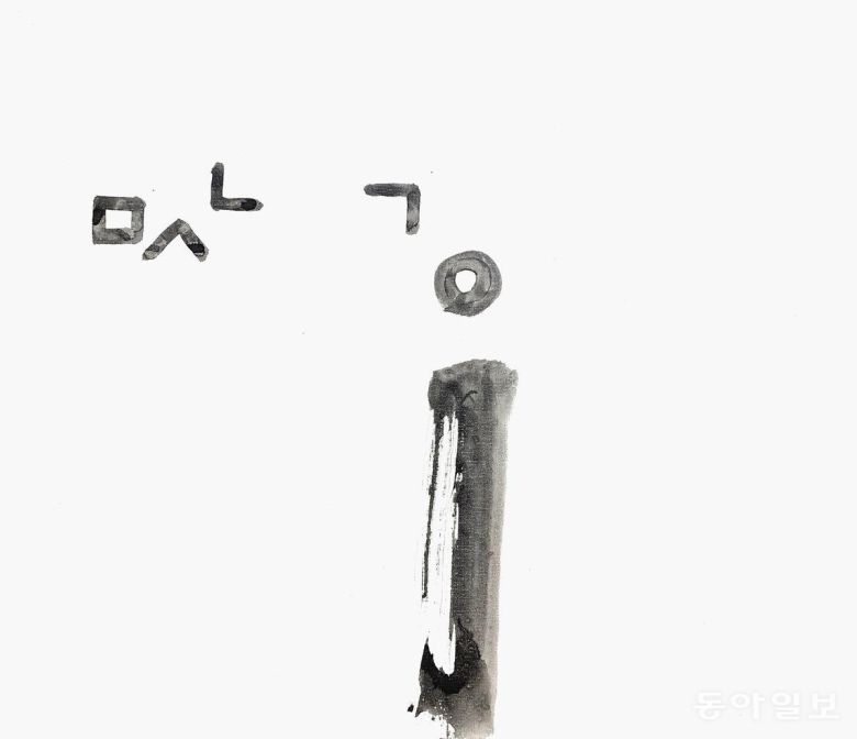 드디어 ‘아!’하는 소리와 함께 모음이 탄생하는 순간입니다. 글자는 사람의 입을 통해 터져나오는 말씨에서 시작됐습니다. 이를 기록하는 글씨에서 소리가 들리는 듯합니다. 장천 김성태 작가와 깊은 교류를 맺고 있는 배일동 명창(중요무형문화재 5호 판소리 이수자)의 깊은 울림통에서 터져나오는 ‘아~’ 소리를 듣는 듯하네요. 왼쪽에 사람(l)과 오른쪽에 하늘(·)이 만나니 오른쪽에 하늘이 있어 양(陽)이고 음은 ‘아’가 됩니다.