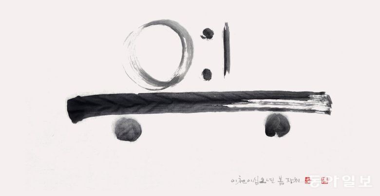 한글은 어떤 문자보다도 건축학적인 아름다움이 돋보이는 글씨입니다. 김 작가가 쓴 ‘여유’라는 글씨는 넓은 탁자 위에 동그라미와 가로획, 세로획만으로 안정적인 건물을 세워놓은 듯한 느낌이네요.