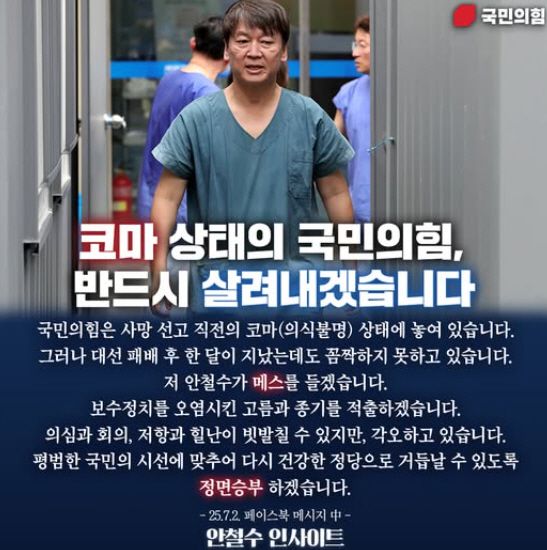 6일 국민의힘에 따르면 안철수 위원장은 대부분의 국민의힘 의원들이 윤석열 대통령 탄핵에 반대할 때 찬성했던 대표적 '찬탄파' 인물일 만큼, 당이 윤석열 전 대통령의 비상계엄 선포와 대통령 탄핵을 철저히 반성해야 한다고 강조하는 개혁파다. 윤석열 정부 출범 전 인수위원장을 맡았으나, 의대 정원 확대 정책 등 의정갈등과 관련한 정부 정책 방향에 반대하는 발언을 꾸준히 내놨다.