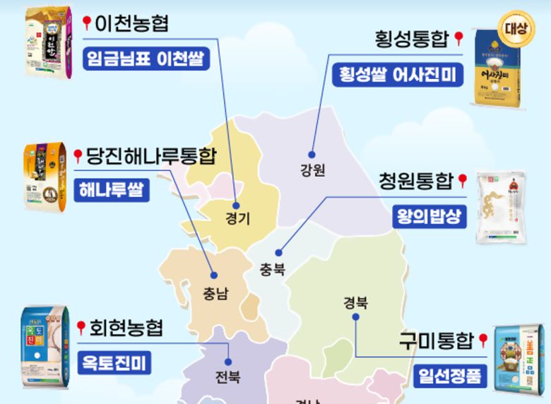 2위부터 8위에는 ▲충남 해나루쌀(당진해나루쌀조합공동사업법인) ▲전남 한눈에반한쌀(옥천농협) ▲경기 임금님표 이천쌀(이천농협) ▲충북 왕의밥상 특등급(청원생명쌀조합공동사업법인) ▲경남 수려한합천(합천농협연합RPC) ▲경북 일선정품(구미시농협쌀조합공동사업법인) ▲전북 옥토진미(회현농협)가 선정됐다.