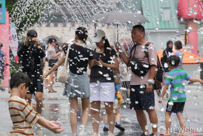 [서울=뉴스핌] 양윤모 기자 = 휴일을 맞아 서울의 기온이 33도까지 올라간 6일 오후 광화문광장 분수터널을 찾은 시민들이 무더위를 식히고 있다. 2025.07.06 yym58@newspim.com