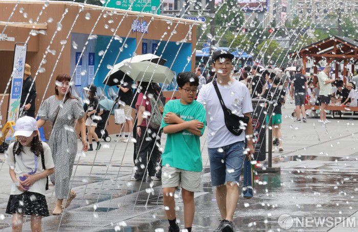 [서울=뉴스핌] 양윤모 기자 = 휴일을 맞아 서울의 기온이 33도까지 올라간 6일 오후 광화문광장 분수터널을 찾은 시민들이 무더위를 식히고 있다. 2025.07.06 yym58@newspim.com