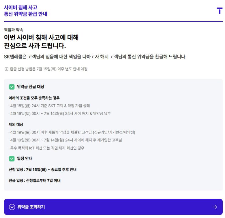 SK텔레콤이 해킹 사고로 계약을 해지한 고객을 대상으로 ‘위약금 환급액 조회’ 서비스를 시작했다.