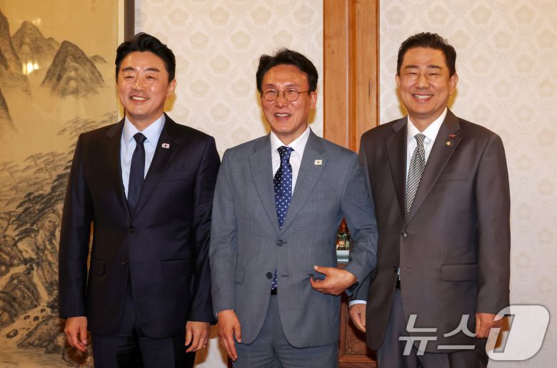 김민석 국무총리(가운데)와 김병기 더불어민주당 당대표 직무대행 겸 원내대표(오른쪽), 강훈식 대통령 비서실장(왼쪽)이 6일 오후 서울 종로구 삼청동 국무총리 공관에서 열린 이재명 정부 첫 고위당정협의회에서 기념촬영을 하고 있다. (공동취재) ⓒ News1 김성진 기자