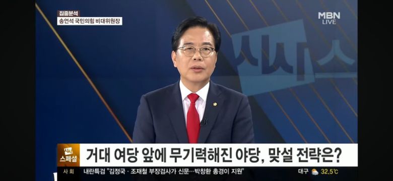 송 비대위원장은 이재명 정권 한 달을 어떻게 보느냐는 질문에는 "이재명 대통령과 이재명 정권은 한마디로 말의 성찬이라고 생각된다"며 "말로는 협치를 얘기하는데 사실상은 야당을 인정 안하는 상황"이라고 비판했습니다.
