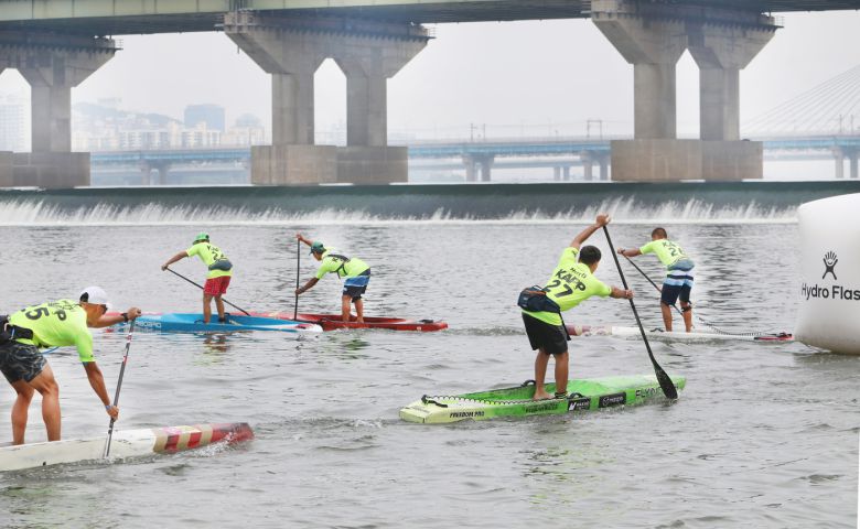 (서울=뉴스1) = 6일 서울 잠실한강공원 수상지역에서 열린 2025 APP월드투어 서울 SUP 오픈 대회에서 남자 프로 9km 장거리 경기 출전 선수들이 힘차게 패들을 저어 반환점을 돌고 있다.(대한패들서프프로협회 제공. 재판매 및 DB 금지) 2025.7.6/뉴스1