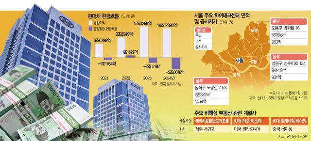 현대차그룹의 이번 부동산 유동화 추진은 ‘성장을 위한 투자에 사활을 걸어야 한다’는 전략 변화로 분석된다. 현대차그룹은 올해 초 발표한 사업 계획에서 자동차 부문에만 연 16조 9000억 원 규모의 투자를 집행하겠다고 밝혔다. 여기에 미국 조지아주 전기차 전용 공장과 배터리 합작법인, 자율주행·로보틱스 연구개발(R&D), 계열사 현대제철의 루이지애나 제철소 건설까지 감안하면 중장기 투자 규모는 30조 원을 훌쩍 넘는다. 삼성동 글로벌비즈니스센터(GBC) 건설에도 조 단위의 비용이 들어갈 것으로 예상된다. 이 같은 대규모 사업 재편 비용을 감당하려면 단순 영업이익만으로는 역부족이라는 게 현대차 안팎의 시각이다.
