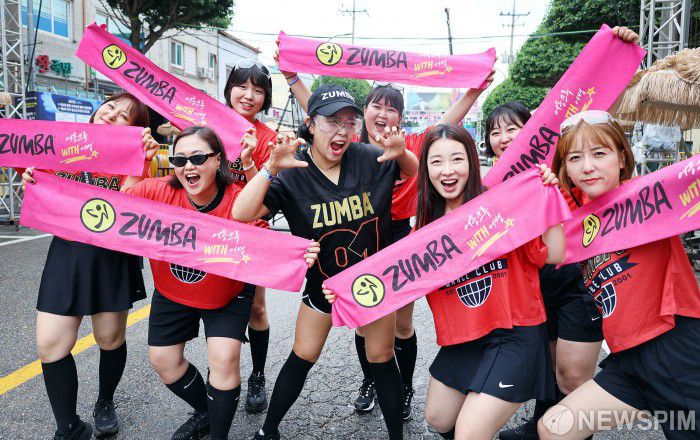 [서울=뉴스핌] 양윤모 기자 = 6일 평창군 진부면 시가지에서 열린 '제2회 오대산천 줌바경연대회' 참가자들이 줌바수건을 펼치고 기념사진을 촬영하고 있다. 올해 행사에는 국내외 40여 개 팀이 참가해 축하 공연, 경연, DJ 파티타임, 마스터클래스 줌바시연 등을 펼친다. [사진=평창군청] 2025.07.06 yym58@newspim.com |