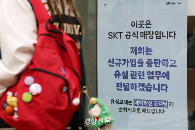 유심 해킹 사태로 SKT 전국 T월드 매장에서 신규 가입 업무가 중단된 지난 5월 서울 시내 한 SKT 대리점에 관련 안내문이 붙어 있다. 정효진 기자 |