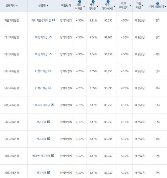 대신저축은행 스마트정기적금과 디비저축은행 정기적금은 연 4.10%의 금리를 제공한다. 세전 이자는 단리 기준 8만6000원이다.