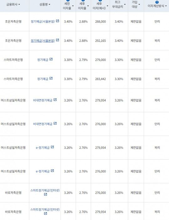 다음으로 높은 금리를 제공하는 상품은 스마트저축은행의 정기예금이다. 연 3.30% 금리를 지원하는 이 상품은 별도 우대조건, 가입대상 제한 및 가입한도가 없다. 세후 이자는 27만9000원이다.