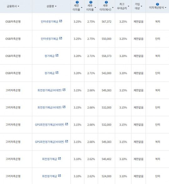 이어 고려저축은행의 '회전정기예금(비대면)', 'GPS 회전정기예금(비대면)'이 연 3.15%의 금리를 제공하며 뒤를 이었다.