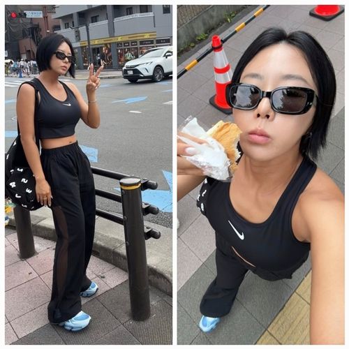 사진 속 이상화는 블랙 스포츠 브라톱에 트레이닝 팬츠, 그리고 푸른빛 스니커즈를 매치한 ‘리얼 워킹룩’을 선보였다. 한 손에는 유부초밥을 든 채 걷고 있었고, 다른 한 손에는 무심하게 걸린 선글라스가 리듬을 완성했다. 시선은 아래로, 자세는 단단하게. 순간을 즐기고 있다는 분위기가 전신에서 뿜어져 나왔다.