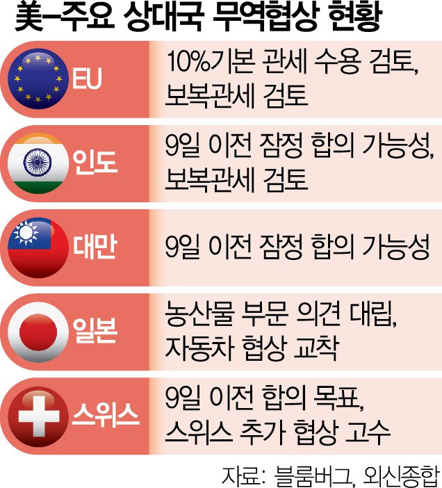 그동안 미국과의 무역 합의에 가장 가까운 나라로 꼽혀왔던 인도도 세계무역기구(WTO)에 미국을 상대로 보복관세를 부과하겠다고 통보했다. 미국이 인도에 부과하는 7억 2500만 달러 규모의 관세만큼 인도도 미국에 부과할 예정이라는 설명이다. 이런 가운데 피유시 고얄 인도 상공부 장관은 “어떤 무역 합의도 마감일이나 시한을 기준으로 하지 않는다”며 “협상이 완전히 마무리되고 국가 이익에 부합할 때만 수용할 것”이라고 말했다.