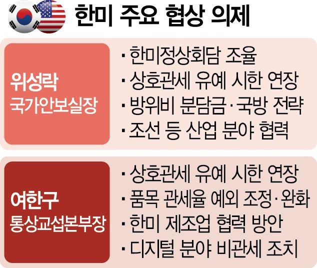 국가 안보와 통상 분야의 수장이 모두 방미한 것은 이 시기를 놓치면 향후 한미 외교가 꼬여버릴 수 있다는 위기감이 작용한 것으로 보인다. 무엇보다 당장 도널드 트럼프 미국 대통령이 상호관세 유예기간 만료일로 통보한 날짜(8일)가 코앞으로 다가오면서 국내 경제에 미치는 타격을 최소화하기 위해 전방위적인 대응에 나섰다는 분석이다. 정치권에서는 위성락 국가안보실장이 관세 협상을 비롯해 한미 정상회담, 안보 협력 등을 큰 틀에서 논의하면 여한구 산업통상자원부 통상교섭본부장은 구체적인 품목별 관세율 조정과 상호관세 유예 연장을 협의할 것으로 보고 있다.