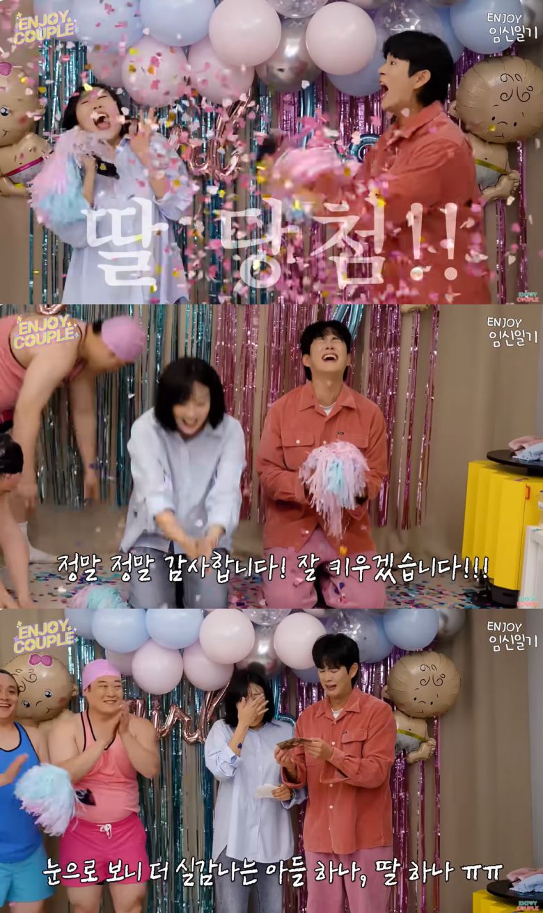 이어 공개된 첫 풍선 속 종이 꽃가루는 아들을 상징하는 파란색이었다. 손민수는 애써 아쉬움을 감추며 두 번째 풍선을 터트렸고 분홍색 꽃가루가 휘날리며 남매 쌍둥이임을 알렸다.