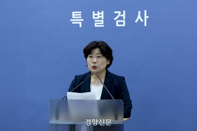 박지영 내란특검 특검보가 6일 서울 서초구 서울고검 기자실에서 윤석열 전 대통령 구속 영장 청구와 관련해 브리핑을 하고 있다. 권도현 기자 |