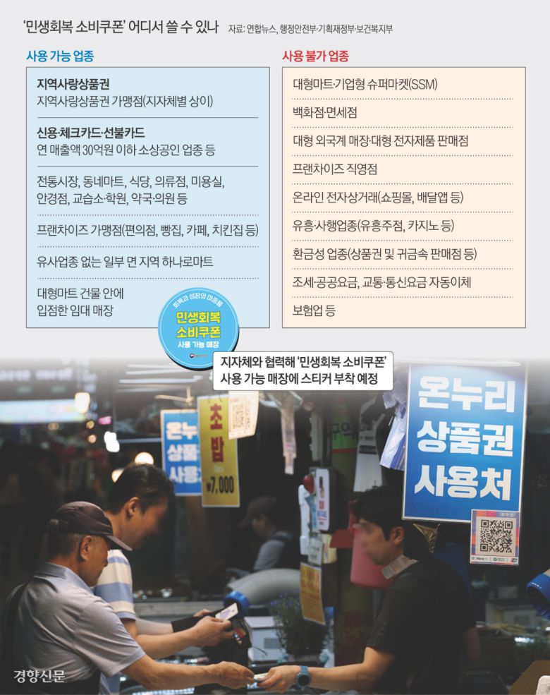 “특별시·광역시 거주자는 해당 특별시·광역시 안에서 쓸 수 있다. 도 지역 거주자는 주소지 시군에서 쓸 수 있다. 예를 들어 강원 춘천시민은 춘천시에서만 쓸 수 있다. 사용처는 연 매출액 30억원 이하의 시장·동네마트, 식당, 옷가게, 미용실, 안경점, 학원, 프랜차이즈 가맹점 등이다. 대형마트와 백화점, 쿠팡 등 온라인 쇼핑몰, 배달의민족 같은 배달앱, 스타벅스 같은 프랜차이즈 본사 직영점에서는 쓸 수 없다. 또 유흥업종과 복권방·오락실 같은 사행업종, 귀금속 판매점 등에선 쓸 수 없다. 다만 배달앱으로 음식 등을 주문하더라도 배달기사를 만나 가맹업체 자체 단말기로 결제할 땐 소비쿠폰을 쓸 수 있다. 편의점·마트·슈퍼마켓이 없는 일부 면 지역에선 예외적으로 농협 하나로마트에서 사용 가능하다. 지역사랑상품권은 기존 상품권 가맹점에서 쓸 수 있다. 가맹점 목록은 각 지자체 홈페이지에서 확인할 수 있다. 정부는 쿠폰을 쓸 수 있는 사업장에 ‘민생회복 소비쿠폰 사용 가능 매장’ 스티커를 부착할 예정이다.”