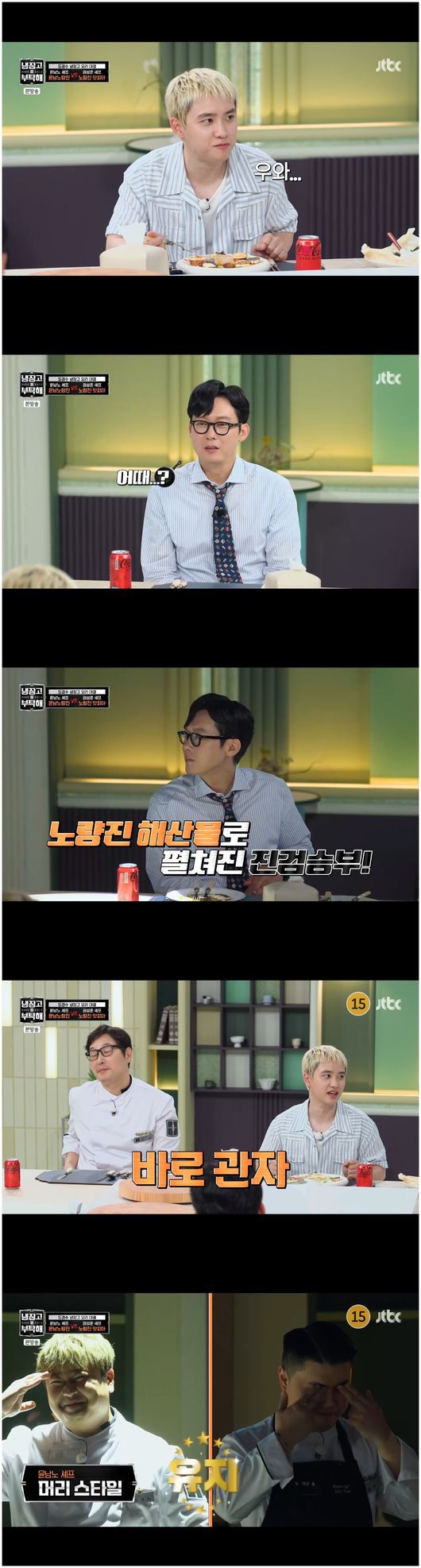 [OSEN=오세진 기자] JTBC '냉장고를 부탁해' 배우 겸 가수 도경수가 탈색 내기를 걸고 두 셰프를 살 떨리게 만들었다.
