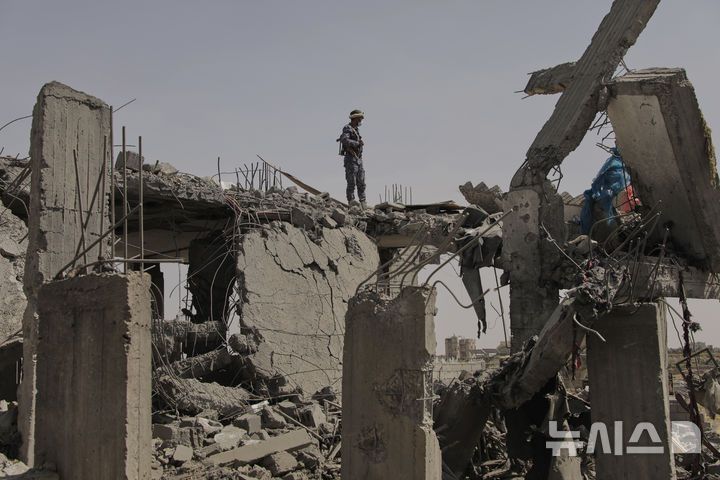 [사나(예멘)=AP/뉴시스] = 예멘의 수도 사나에서 4월 7일 후티군 보안군 장교 한 명이 전날의 미군 폭격으로 무너진 건물 잔해를 조사하고 있다. 2025. 04. 08. |