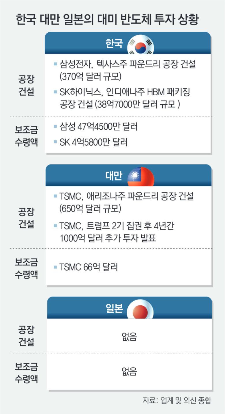 삼성전자와 SK하이닉스는 미국 내에 각각 투자 규모 370억 달러(약 53조 원)와 38억7000만 달러의 첨단 반도체 공장 설립에 나선 상태다. 조 바이든 행정부 때 각각 47억4500만 달러, 4억5800만 달러의 보조금을 약속받았다. TSMC는 지난해 말 650억 달러 투자에 대한 보조금 66억 달러를 받기로 했고, 트럼프 2기 출범 후 1000억 달러 추가 투자도 발표했다.