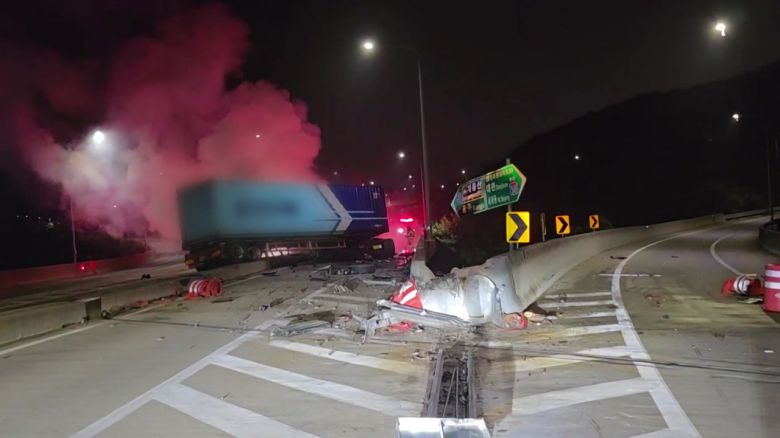 25톤 트레일러가 넘어져 있고 차량 앞부분에는 연기가 피어오릅니다.