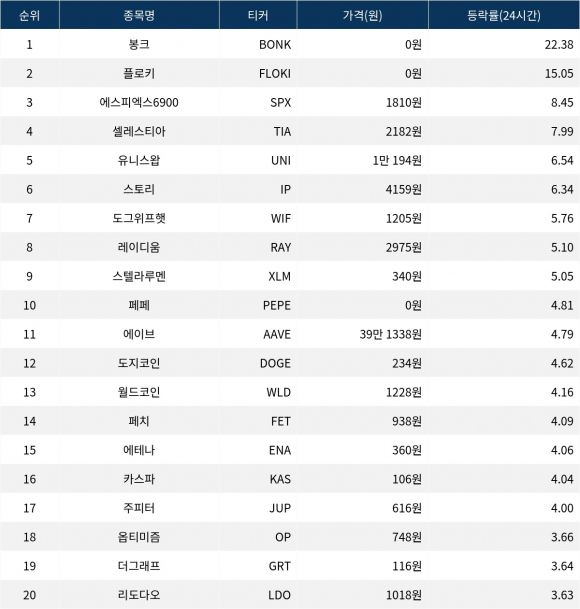 한편, 스토리(IP)는 6.34% 상승하며 주목받고 있다. 도그위프햇(WIF)은 5.76% 상승했고, 레이디움(RAY)은 5.10%의 상승률을 기록했다. 같은 시각, 스텔라루멘(XLM)은 5.05% 상승했고, 페페(PEPE)는 4.81%의 상승률을 보였다. 이들 종목은 각각의 독특한 플랫폼과 기술적 특성을 바탕으로 시장에서의 입지를 강화하고 있다.