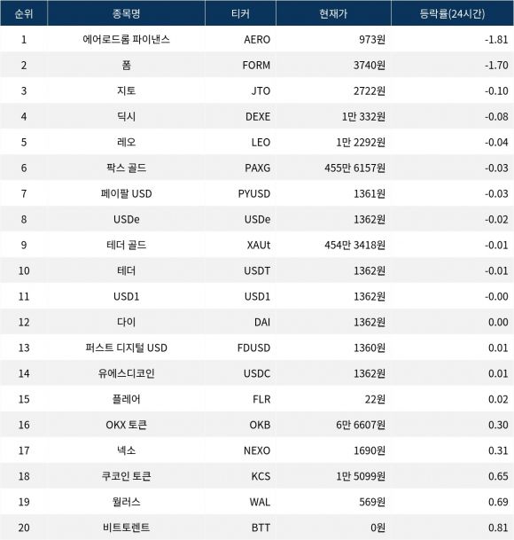 한편, 팍스 골드는 0.03% 하락하여 455만 6157원에 거래되고 있으며, 페이팔 USD는 1361원에 거래되며 같은 시각 0.03% 하락했다. USDe도 0.02% 하락하여 1362원에 거래 중이다. 테더 골드는 0.01% 하락하며 454만 3418원에 거래되고 있으며, USD1은 0.00% 등락률을 보이며 1362원에 거래 중이다.