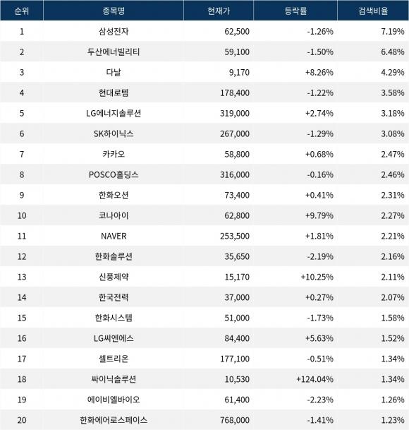 이 밖에도 싸이닉솔루션(234030) ▲124.04%, 신풍제약(019170) ▲10.25%, 코나아이 ▲9.79%, 다날 ▲8.26%, LG씨엔에스(064400) ▲5.63%, NAVER(035420) ▲1.81%, 한국전력(015760) ▲0.27%, 한화오션 ▲0.41%, 카카오 ▲0.68%, POSCO홀딩스 ▼0.16% 등이 많이 검색되고 있다.
