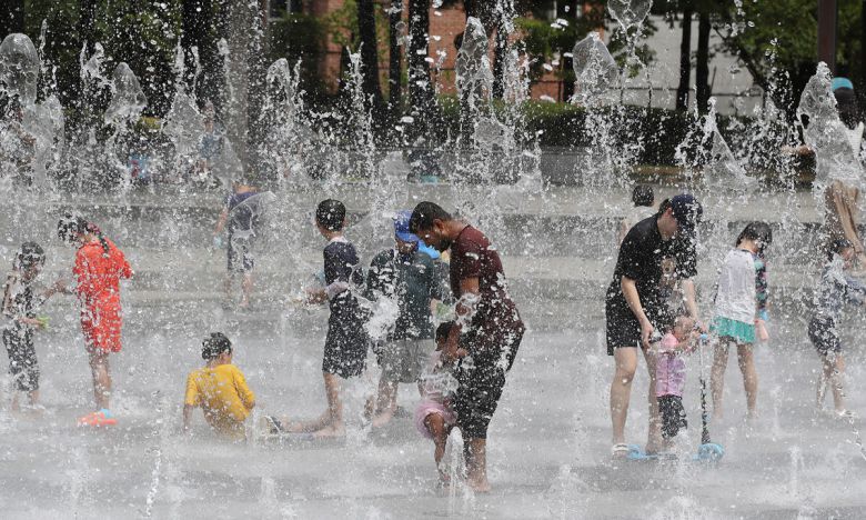 지난 6일 오후 대구 달서구 와룡공원 바닥분수에서 시민들이 물놀이를 즐기며 무더위를 식히고 있다. 뉴스1 |